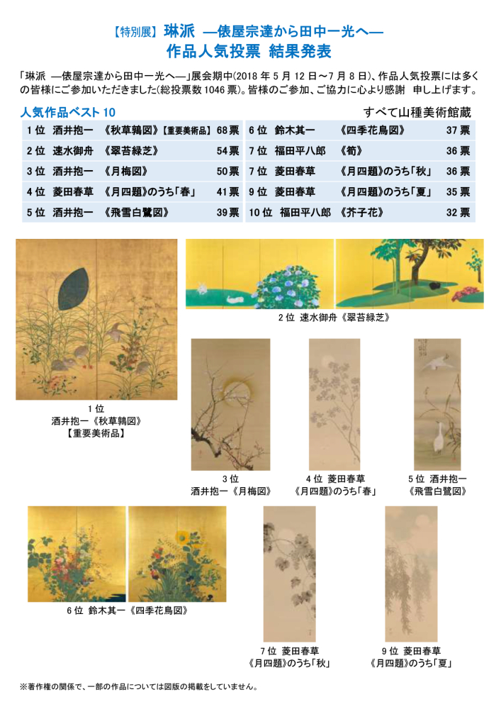 「【特別展】琳派 ―俵屋宗達から田中一光へ―」会期中、作品人気投票には多くの皆様にご参加いただきました。