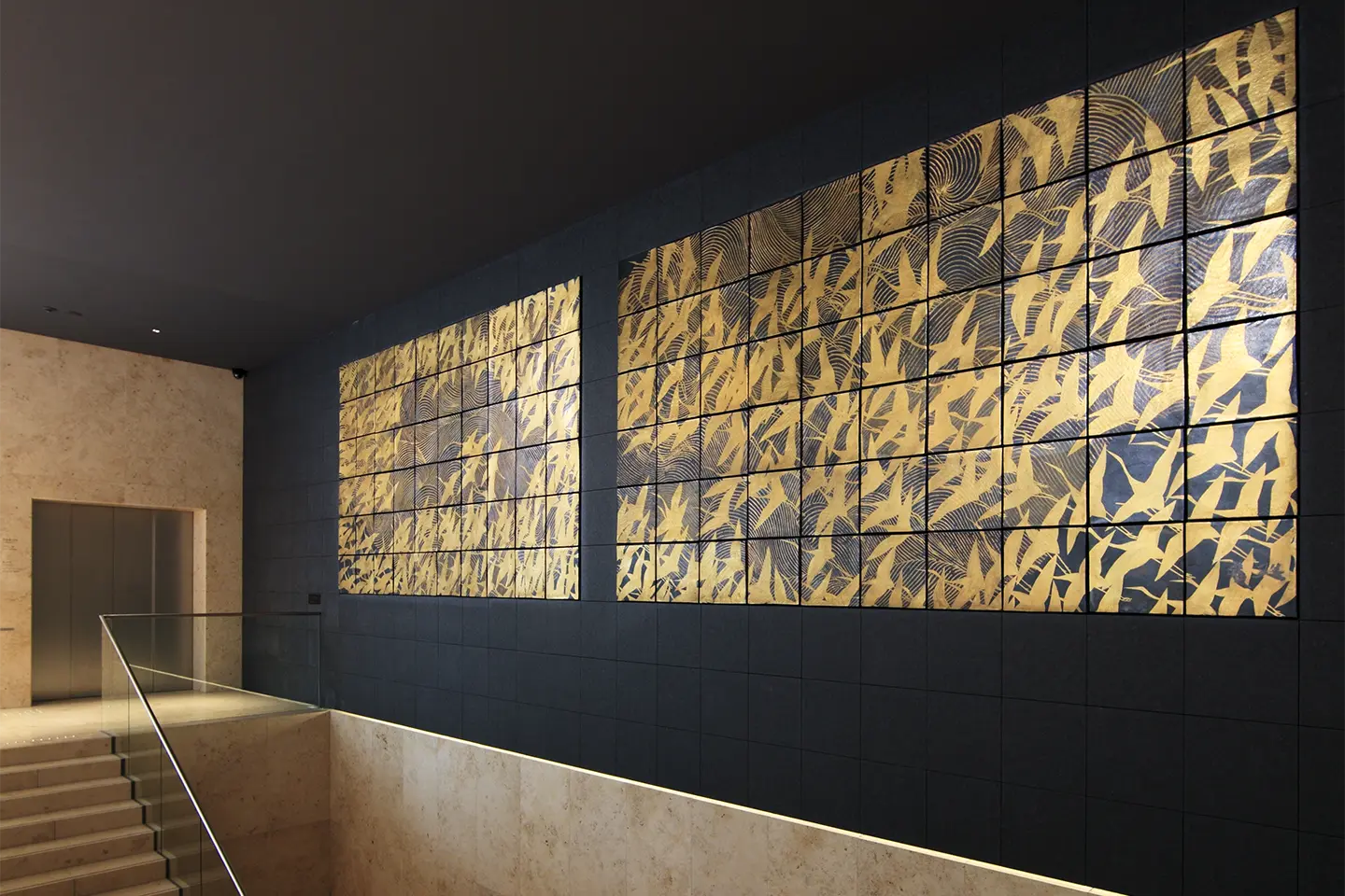 2009年に竣工したワイマッツ広尾ビルは、「品位と格調ある建築」「時代を超えた普遍的価値」「ゆったりと居心地の良い空間」をコンセプトに設計されました。外観は、美術館らしくなおかつ周囲に溶け込むような佇まいが感じられ、短冊状に連続する自然石の重なりの中に1階のロビーだけが見える構成となっています。開放感あふれるロビーから、地下1階の展示室へと至る階段脇の壁面(ロビー入口正面)には、加山又造(1927-2004)の陶板壁画《千羽鶴》が常設され、美術館の顔として皆様をお迎えします。